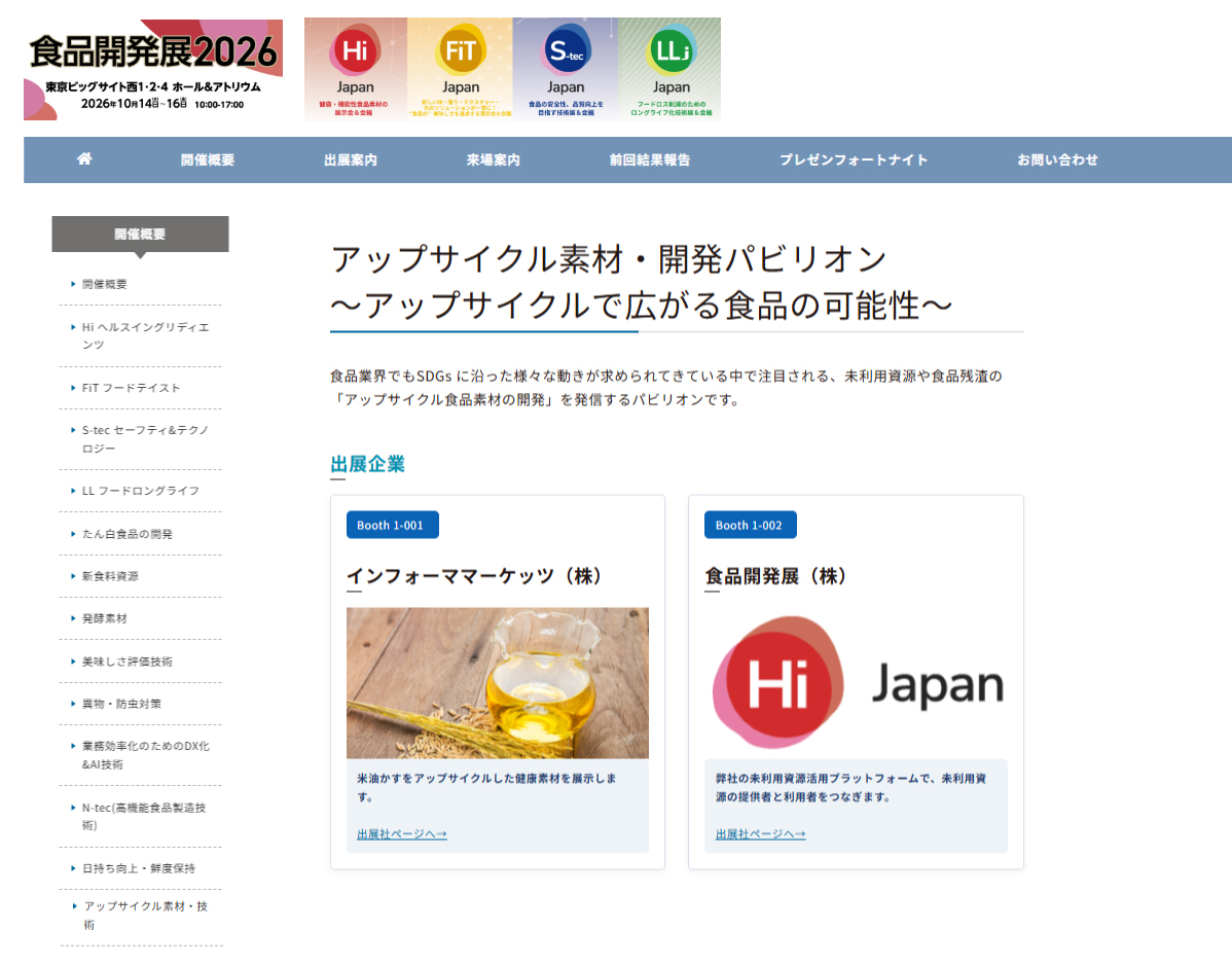 食品業界でもSDGs に沿った様々な動きが求められてきている中で、未利用だった資源の再利用や食品残渣からのアップサイクルが注目を集めるようになってきました。そこで食品開発展2026 で はアップサイクル食品・素材の開発にスポットをあてたパビリオンを設置します。