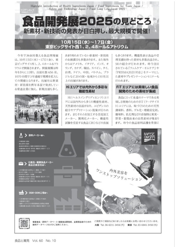 トピックス 注目企業(PR)ひとくちでわかる新感覚の旨味調味料。「えのきエキス」「えのき濃縮だし」 三谷産業㈱ ブース:1-384 先味~後味まで続くかつてない旨味を持つ調味料をえのき茸から作りました。 食材に使用すると、えのき茸の香りは抑制され、同時に酸臭などをマスキングし、旨味やコクを付与します。 たんぱく加水分解物や一部の酵母エキスの代替も可能です。 原料えのき茸は国内工場生産で安定供給可能です。また原料産地限定表示もできます。 免疫力とエネルギーを高めるオーガニックキノコエキスパウダー Shaanxi HongHao Bio-tech Co.,Ltd. ブース:1-015 HongHao Bioは、植物エキス、キノコエキス、果物・野菜パウダー、そして最終製品の配合・包装に至るまで、お客様に合わせたサービスの提供を専門としています。 オーガニック、ISO、BRC、コーシャ、HACCP、SCなど、複数の認証を取得しており、お客様に信頼性の高い製品をお届けいたします。 主な製品:霊芝エキス、シイタケエキス、ヤマブシタケエキス、冬虫夏草エキス、メリロートスエキス、ホスファチジルセリン、緑茶エキス。 今年の見どころ ご自由にダウンロードください 「食品と開発」電子版 食品開発展2025の見どころ(電子版) LLj分野のセミナー・プレゼン・出展社リスト(PDF版) 特別プレゼンテーションリスト(PDF版) 試飲試食実施企業と製品リスト(PDF版) 海外出展社・海外出展社によるプレゼンテーションリスト(PDF版) S-tec分野の出展製品・プレゼンテーションリスト(PDF版) 新素材・新技術リスト(PDF版) 新規出展企業リスト(PDF版) 出展社プレゼンプログラム(PDF版) 記念セミナープログラム(PDF版)