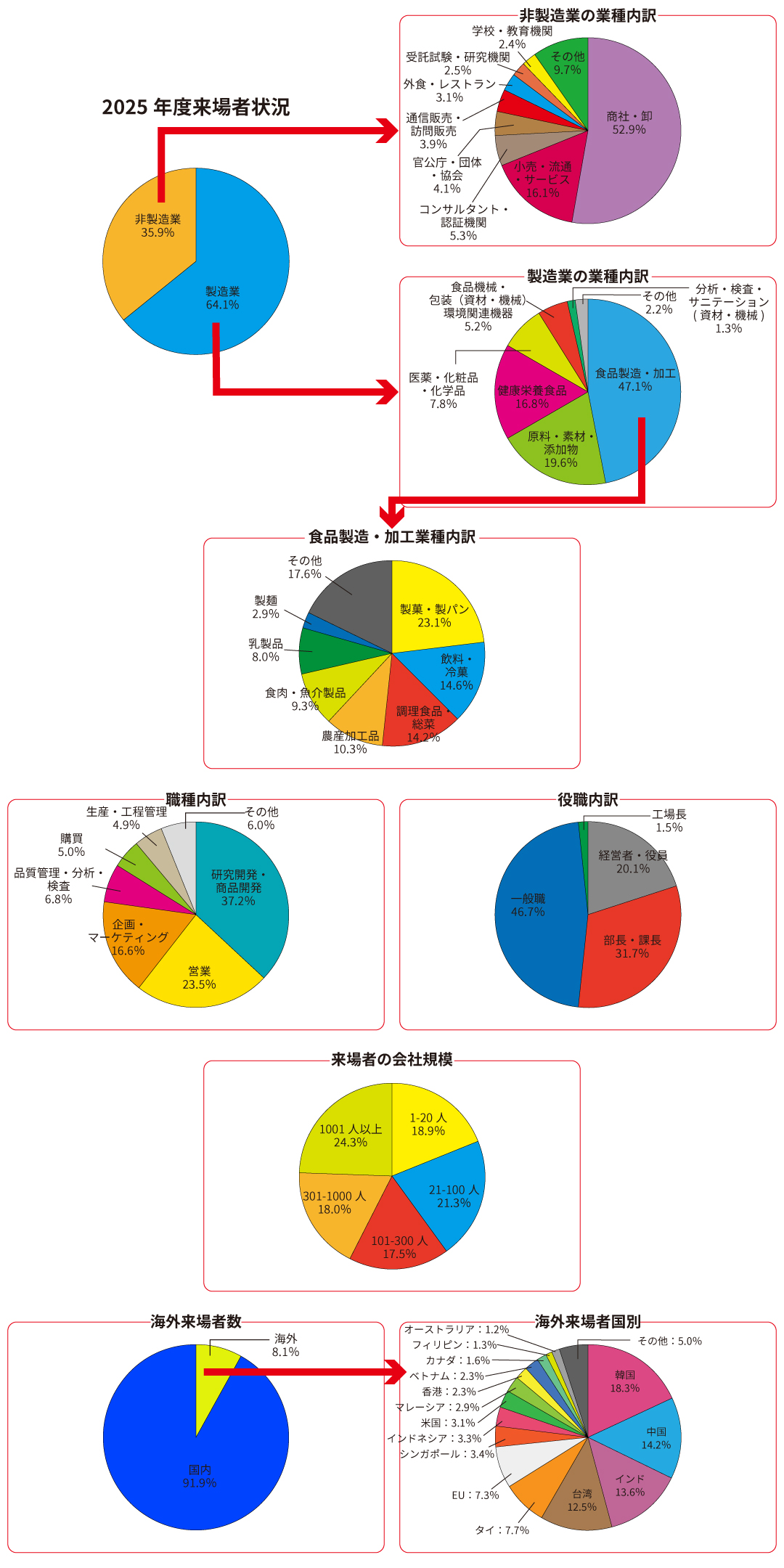 前回結果報告 出展登録社数 671社 出展小間数 1,074小間 来場者数 37,716人(前年38,028人) 来場者数内訳 2025年10月15日(水) 12,403人(前年12,635人) 2025年10月16日(木) 12,618人(前年12,881人) 2025年10月17日(金) 12,695人(前年12,512人) セミナー参加者 出展社プレゼンテーション 10,185人 来場者データ